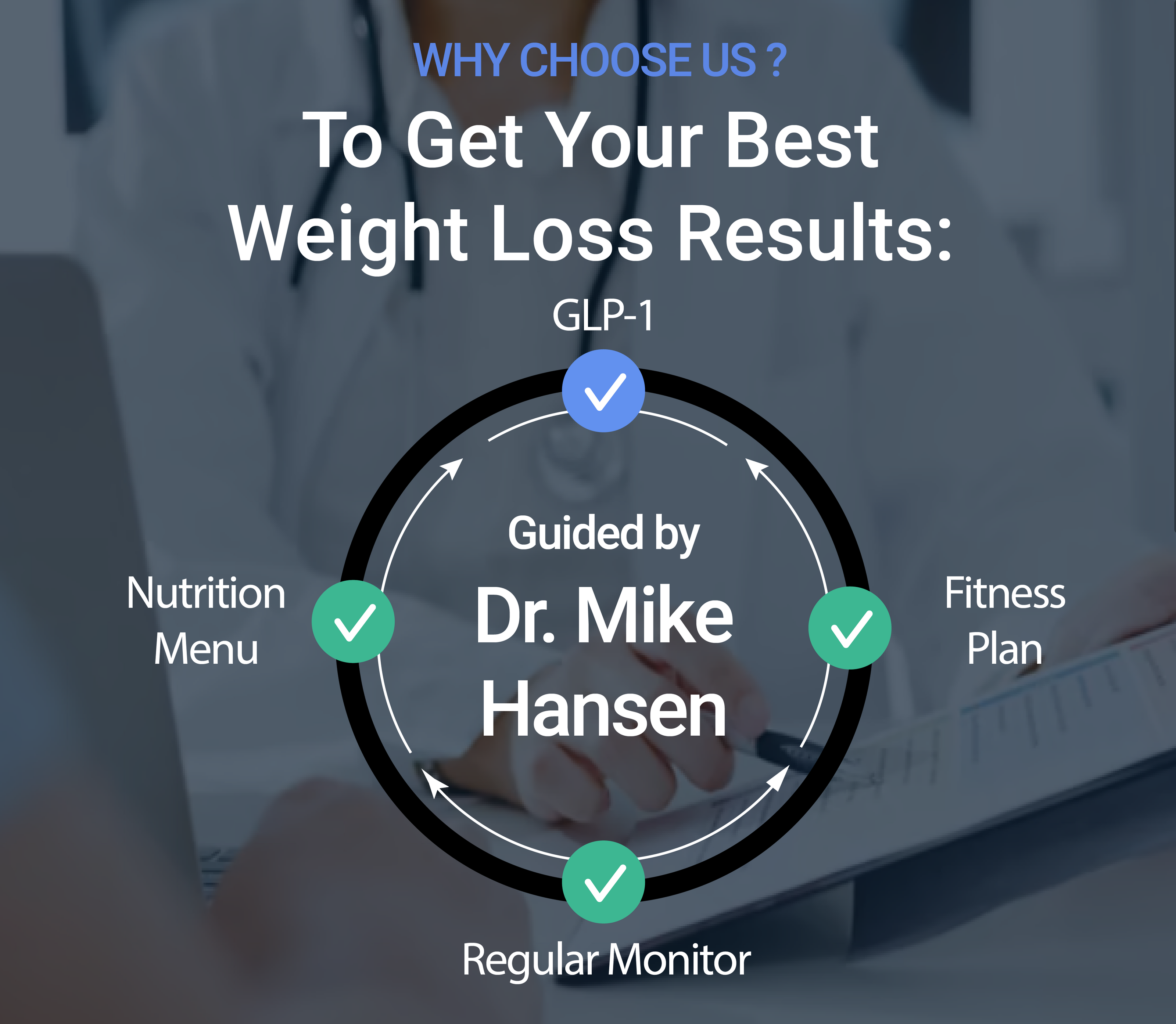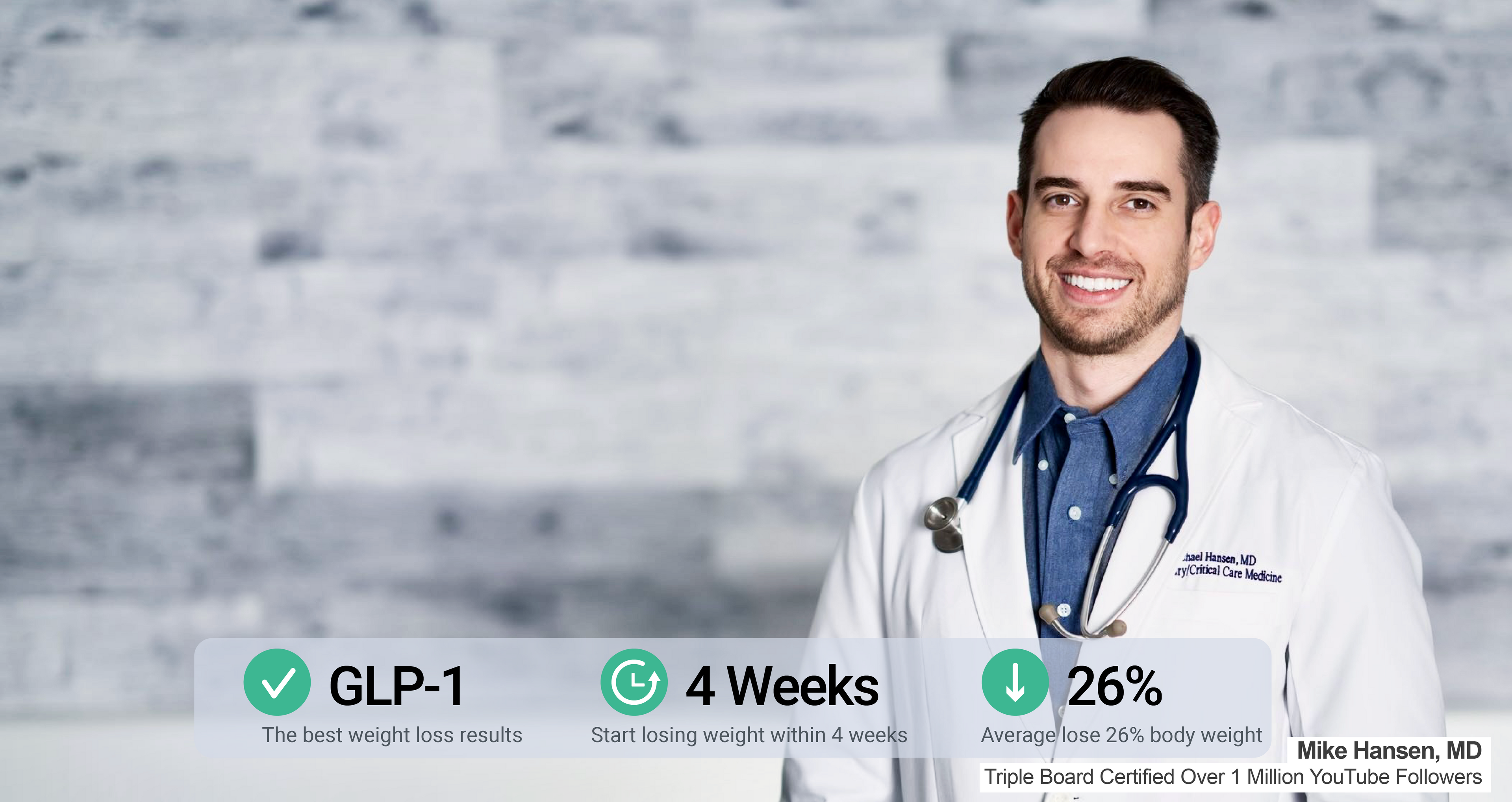 We combine GLP-1 treatment, personalized nutrition guidance, and expertise from renowned & board certified Dr. Mike Hansen, to provide you your best weight loss journey.